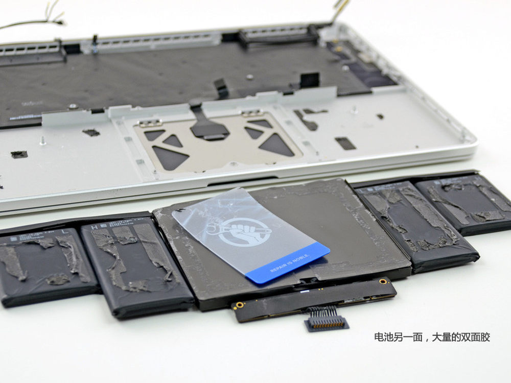 视网膜屏幕MacBook Pro的电池是粘在机壳上面的,没有必要的话请不要对其进行拆卸操作,以免造成电芯的不稳定。17/19
