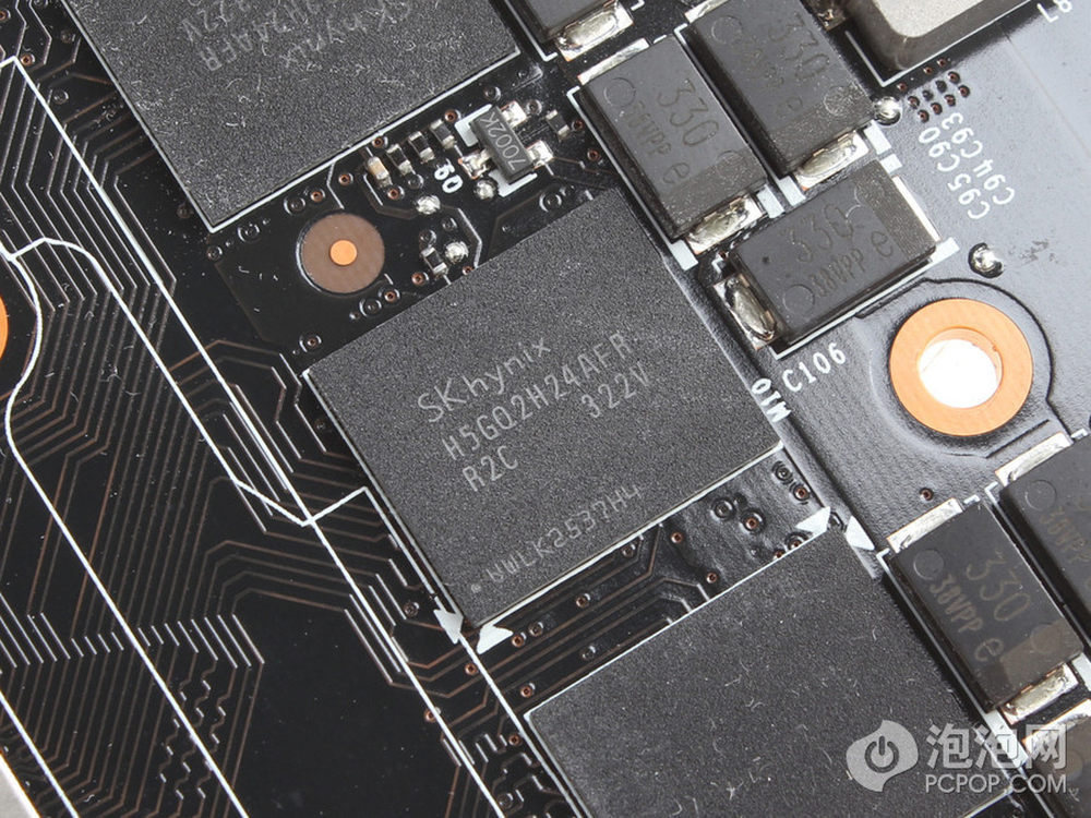 显卡采用了背板设计,可以有效的保护PCB板以及帮助PCB散热,实际上,显卡采用的是双背板设计,在PCB的正面同样设计有一个一体成形的散热板,可以针对显存以及供电部分散热。6/13