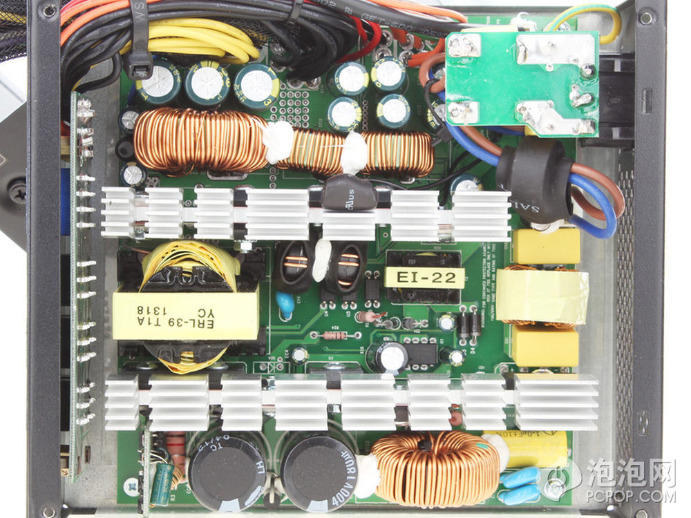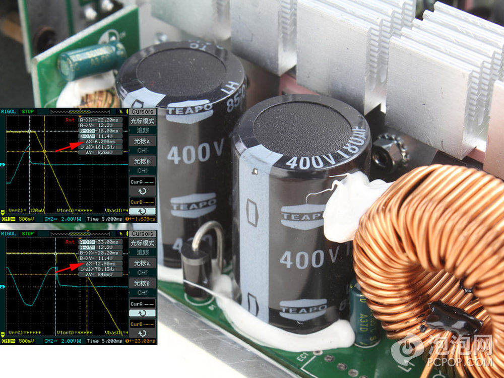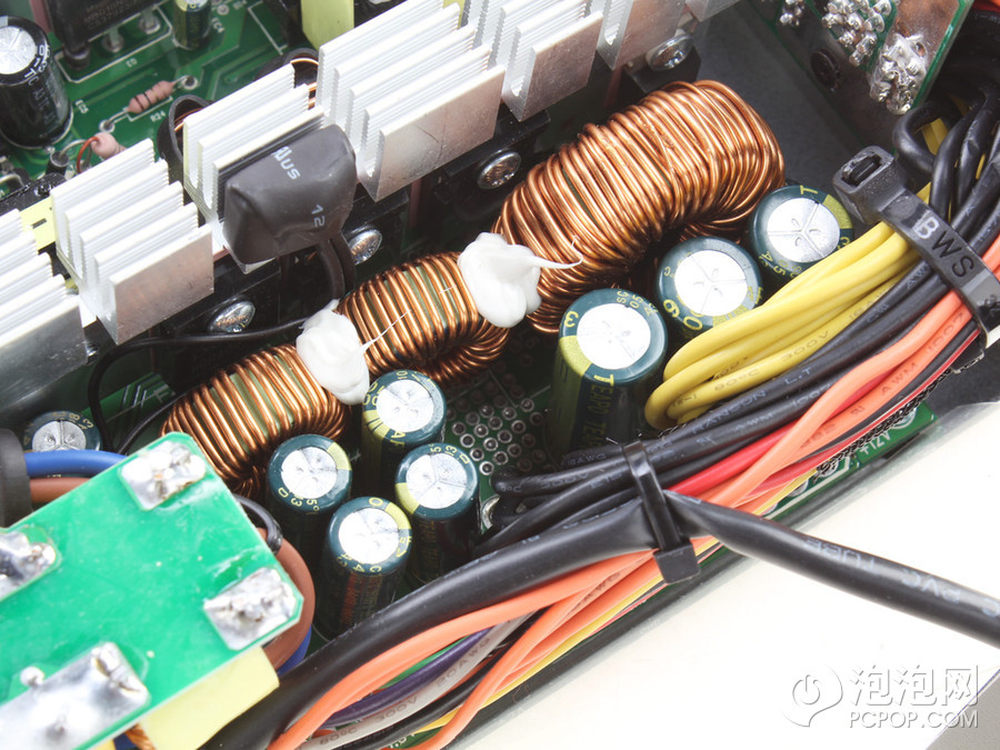 二次侧的照片可以看出B650M采用了双磁放大结构,这种结构的电源由于12V、5V、3.3V三路输出分别调压,所以比12V和5V使用同一个线圈调压要有更好的适应性,因为最近Intel处理器有了更低的待机功耗,所以那时12V输出是很低的,而单磁放大结构的电源在这时可能会导致5V电压的异常低。甚至出现低压保护。所以采用双磁放大结构的电源兼容性更好。而现在很多采用单磁放大的电源也在包装上乱标一个支持Hasewell的Logo出来,这些厂商真是没法和利豹的正规做法比了。16/17