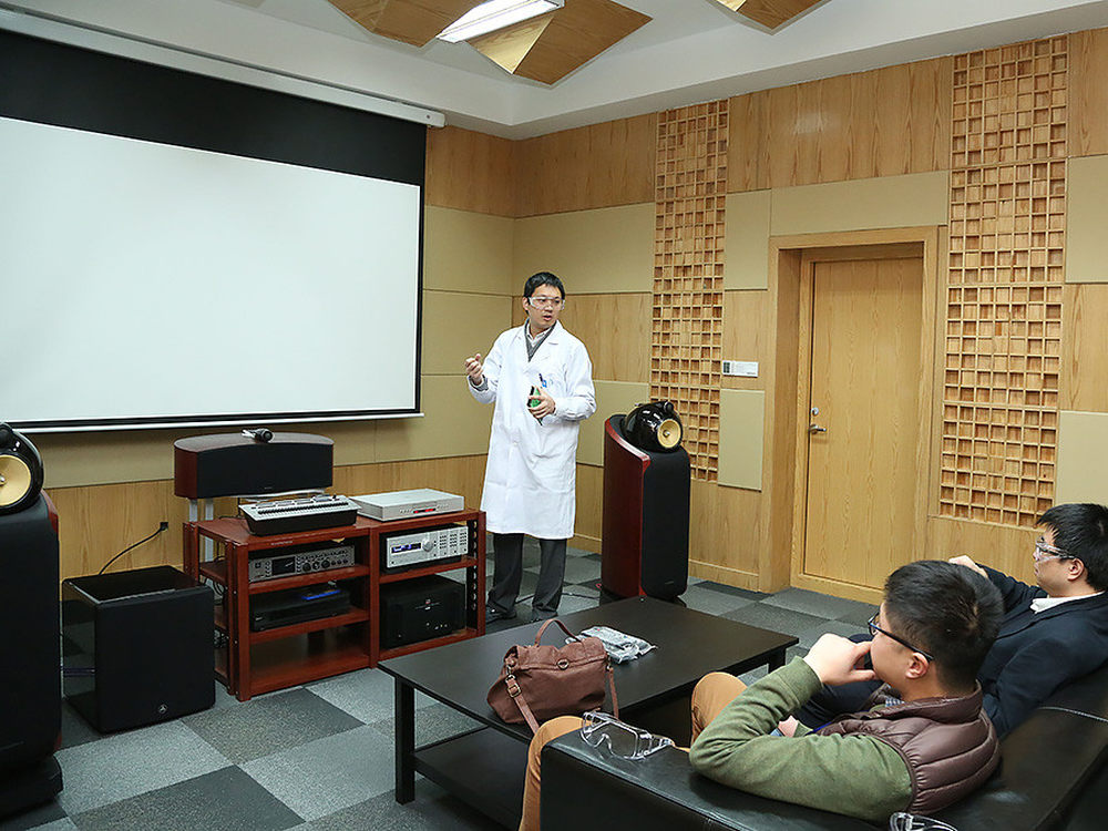 工程师向媒体介绍电气实验室内的听音室。19/21