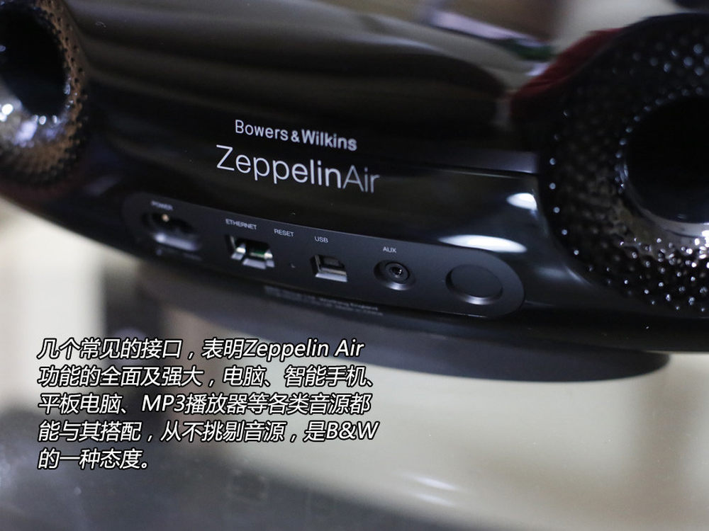 几个常见的接口,表明Zeppelin Air功能的全面及强大,电脑、智能手机、平板电脑、MP3播放器等各类音源都能与其搭配,从不挑剔音源,是B&W的一种态度。10/11