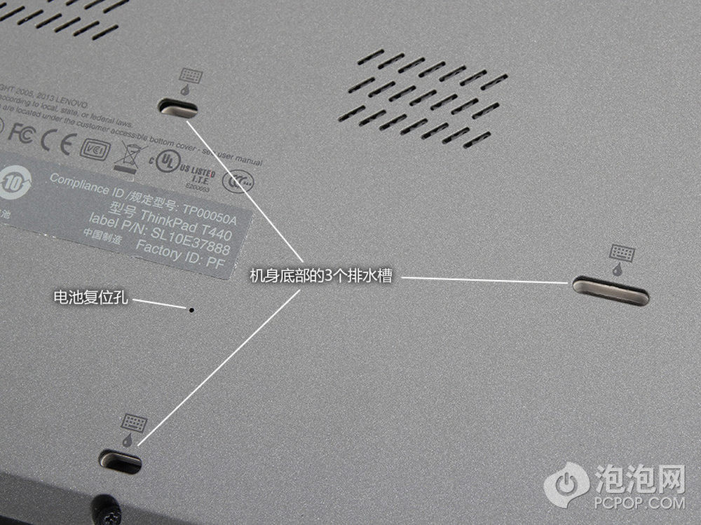 ThinkPad T440机身底部的三个排水孔以及电池复位孔。