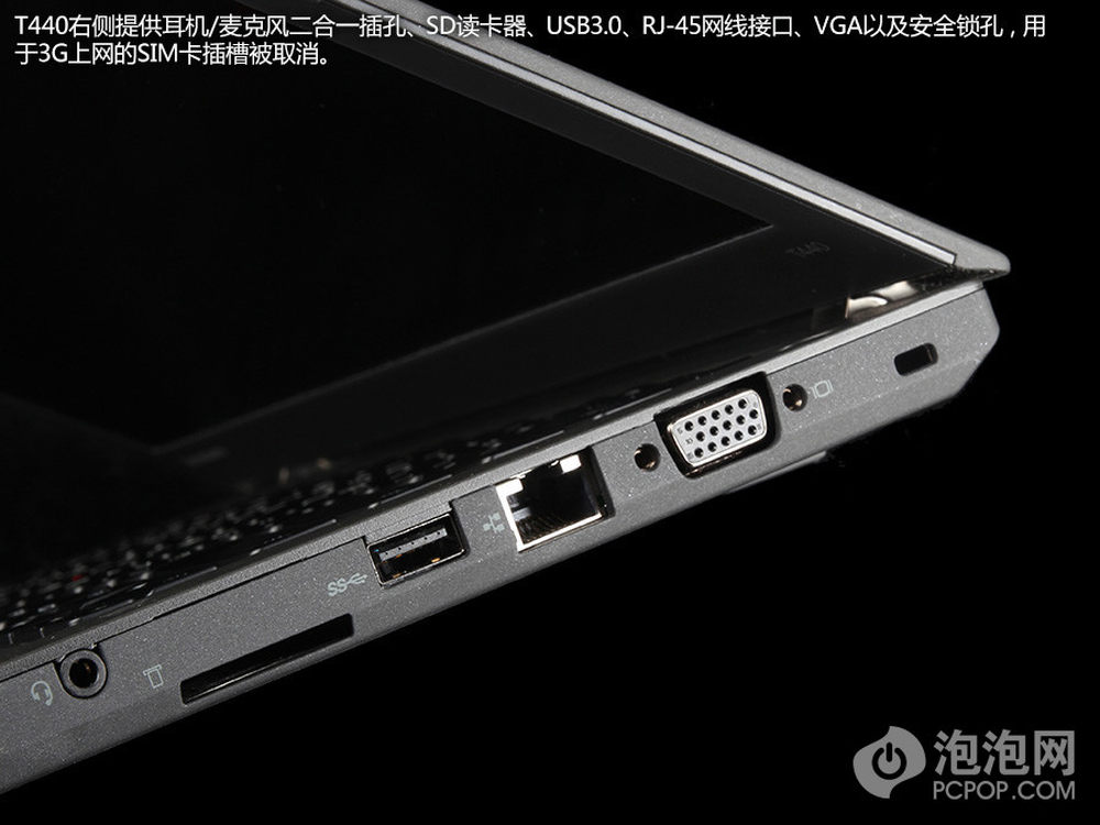 T440右侧提供耳机/麦克风二合一插孔、SD读卡器、USB3.0、RJ-45网线接口、VGA以及安全锁孔,用于3G上网的SIM卡插槽被取消。