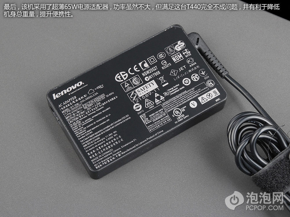 最后,该机采用了超薄65W电源适配器,功率虽然不大,但满足这台T440完全不成问题,并有利于降低机身总重量,提升便携性。