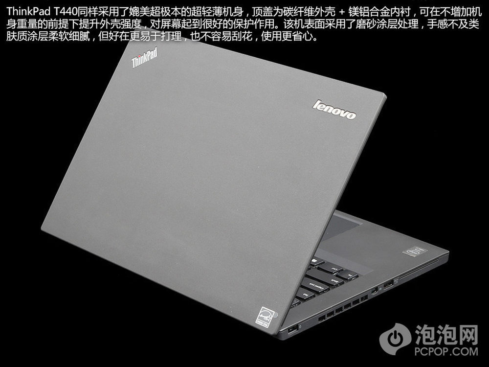 ThinkPad T440同样采用了媲美超极本的超轻薄机身,顶盖为碳纤维外壳 镁铝合金内衬,可在不增加机身重量的前提下提升外壳强度,对屏幕起到很好的保护作用。该机表面采用了磨砂涂层处理,手感不及类肤质涂层柔软细腻,但好在更易于打理,也不容易刮花,使用更省心。