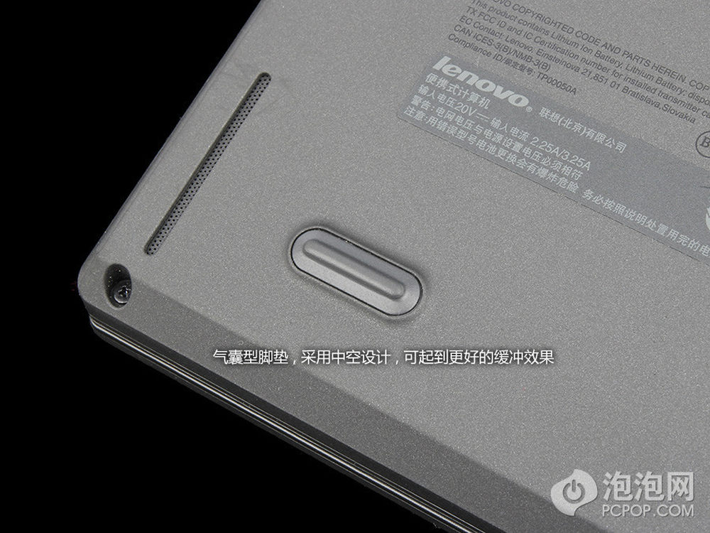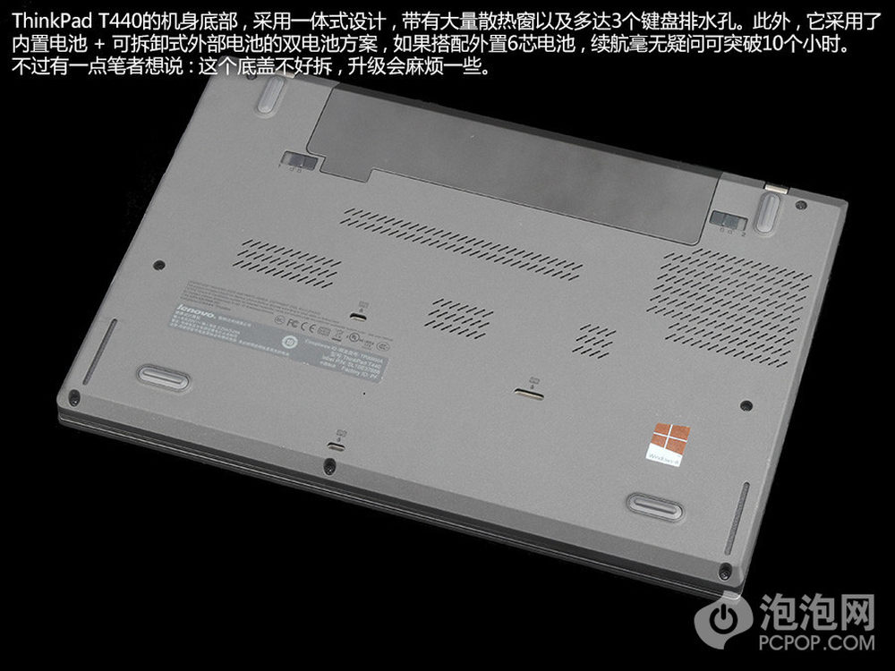 ThinkPad T440的机身底部,采用一体式设计,带有大量散热窗以及多达3个键盘排水孔。此外,它采用了内置电池 可拆卸式外部电池的双电池方案,如果搭配外置6芯电池,续航毫无疑问可突破10个小时。