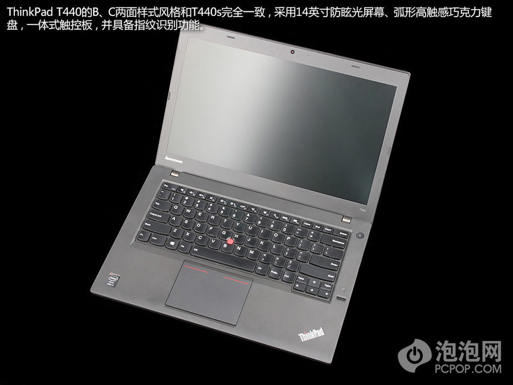 ThinkPad T440的B、C两面样式风格和T440s完全一致,采用14英寸防眩光屏幕、弧形高触感巧克力键盘,一体式触控板,并具备指纹识别功能。