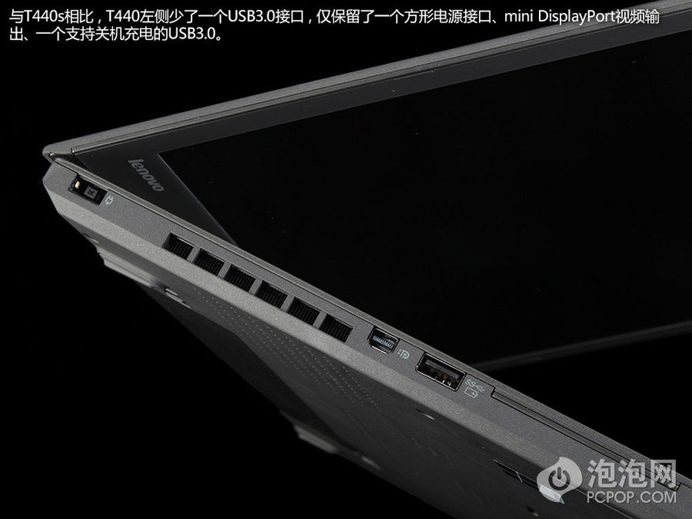 与T440s相比,T440左侧少了一个USB3.0接口,仅保留了一个方形电源接口、mini DisplayPort视频输出、一个支持关机充电的USB3.0。
