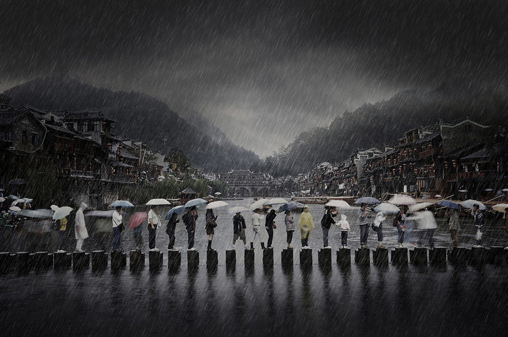 开放竞争:照片“雨中古镇”拍摄于中国南方凤凰镇,这幅照片显示了一个人们在雨季在雨中穿行的场景。在这个背景中有老式居住建筑和老式石桥。7/25