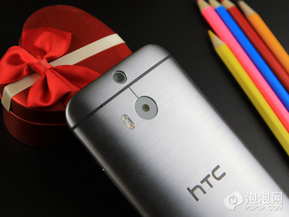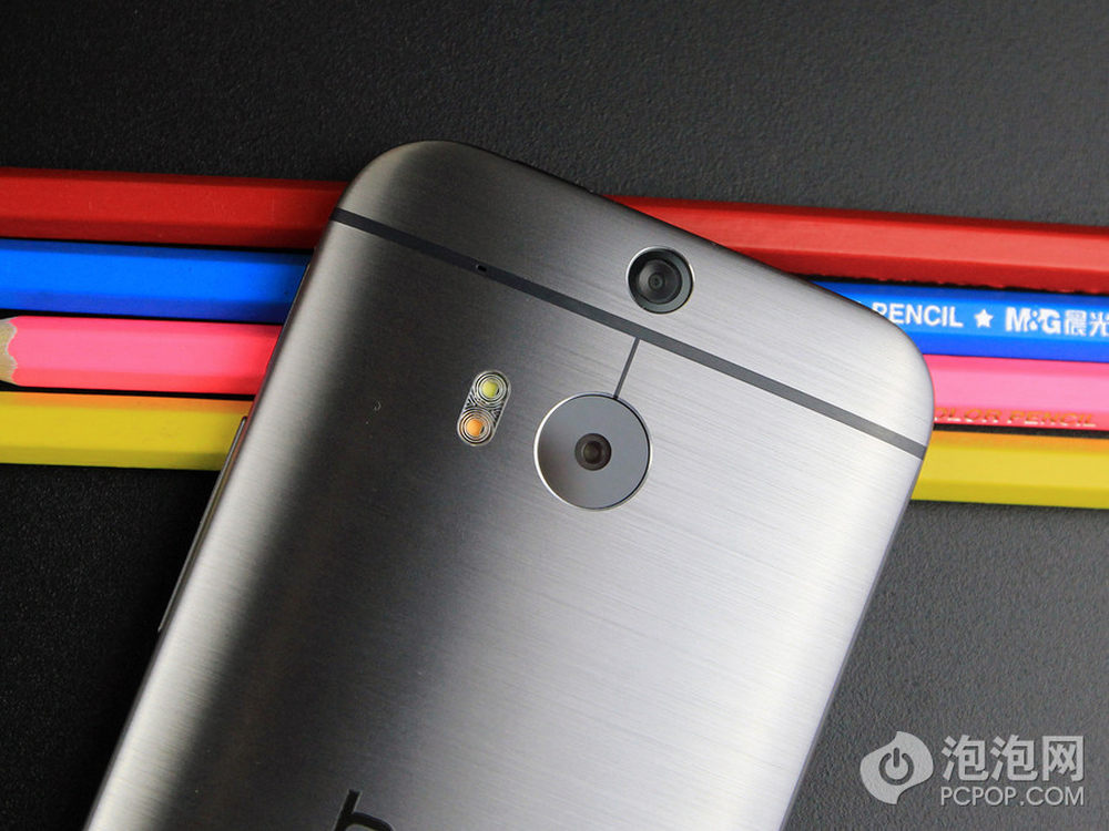手机背部采用的“Duo Camera”双镜头设计,不过只有下面的镜头为UltraPixel超像素摄像头,上面的镜头用于记录景深信息。双摄像头可以让手机实现光场相机效果,后期修改更加丰富,如修改对焦,抽色,修改部分效果等,甚至普通照片也能有3D效果。